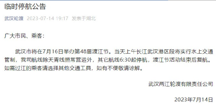 7鏈14鏃ワ紝姝︽眽杞浮鍙戝竷涓存椂鍋滆埅鍏憡锛氭姹夊競灏嗗湪7鏈16鏃ヤ妇鍔炵48灞婃浮姹熻妭銆傚綋澶╀笂鍗堥暱姹熸姹夋腐鍖烘灏嗗疄琛屾按涓婁氦閫氱鍒讹紝璇ュ徃鑸嚎闄ゅぉ闈掔嚎鐓у父钀ヨ繍澶栵紝鍏跺畠鑸嚎6:30璧峰仠鑸紝娓℃睙鑺傛椿鍔ㄧ粨鏉熷悗澶嶈埅銆傚闇杩囨睙鐨勪箻瀹㈣閫夋嫨鍏朵粬浜ら氬伐鍏凤紝濡傛湁涓嶄究鏁璋呰В銆