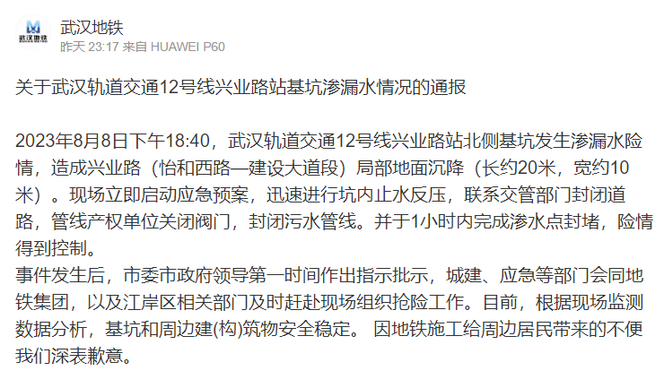 2023骞8鏈8鏃ヤ笅鍗18:40锛屾姹夎建閬撲氦閫12鍙风嚎鍏翠笟璺珯鍖椾晶鍩哄潙鍙戠敓娓楁紡姘撮櫓鎯咃紝閫犳垚鍏翠笟璺紙鎬″拰瑗胯矾鈥斿缓璁惧ぇ閬撴锛夊眬閮ㄥ湴闈㈡矇闄嶏紙闀跨害20绫筹紝瀹界害10绫筹級銆傜幇鍦虹珛鍗冲惎鍔ㄥ簲鎬ラ妗堬紝杩呴熻繘琛屽潙鍐呮姘村弽鍘嬶紝鑱旂郴浜ょ閮ㄩ棬灏侀棴閬撹矾锛岀绾夸骇鏉冨崟浣嶅叧闂榾闂紝灏侀棴姹℃按绠$嚎銆傚苟浜1灏忔椂鍐呭畬鎴愭笚姘寸偣灏佸牭锛岄櫓鎯呭緱鍒版帶鍒躲