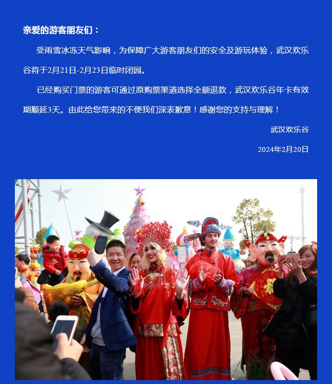 鎹姹夋涔愯胺瀹樻柟寰崥23鏃ユ秷鎭紝鐢变簬鎸佺画鐨勯洦闆ぉ姘旓紝涓轰繚闅滃箍澶ф父瀹㈡湅鍙嬩滑鐨勫畨鍏ㄥ強娓哥帺浣撻獙锛屾姹夋涔愯胺浜2024骞2鏈24鏃ヨ嚦25鏃ヤ复鏃堕棴鍥