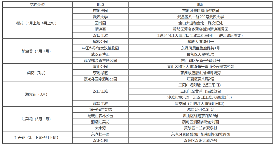 澶╂皵閫愭杞殩锛岄殢鐫姊呰姳銆侀儊閲戦銆佹ū鑺辩瓑澶氱鑺卞崏閫愭杩涘叆鐩涜姳鏈燂紝姝︽眽甯傚澶勭儹闂ㄧ偣浣嶉檰缁繘鍏ヨ祻鑺辨湡锛屽叾涓В鏀惧叕鍥佹姹夋鐗╁洯銆佷笢婀栨鍥佹櫞宸濋榿銆佸牑瑙掑叕鍥佹矙婀栧叕鍥佷腑灞卞叕鍥佹柊鍩庡尯鐨勮姳鍗氭眹銆侀儊閲戦涓婚鍏洯绛夊叕鍥拰鏅尯鍥犺姳鍗夌绫诲鎴栬姳鏈熸椂闂撮暱锛岄璁″惛寮曡緝澶氬競姘戝墠寰锛屽懆鏈湡闂磋祻鑺卞尯鍩熷懆杈瑰彲鑳戒細鍑虹幇杞﹁締杩濆仠鑷村牭鐜拌薄銆