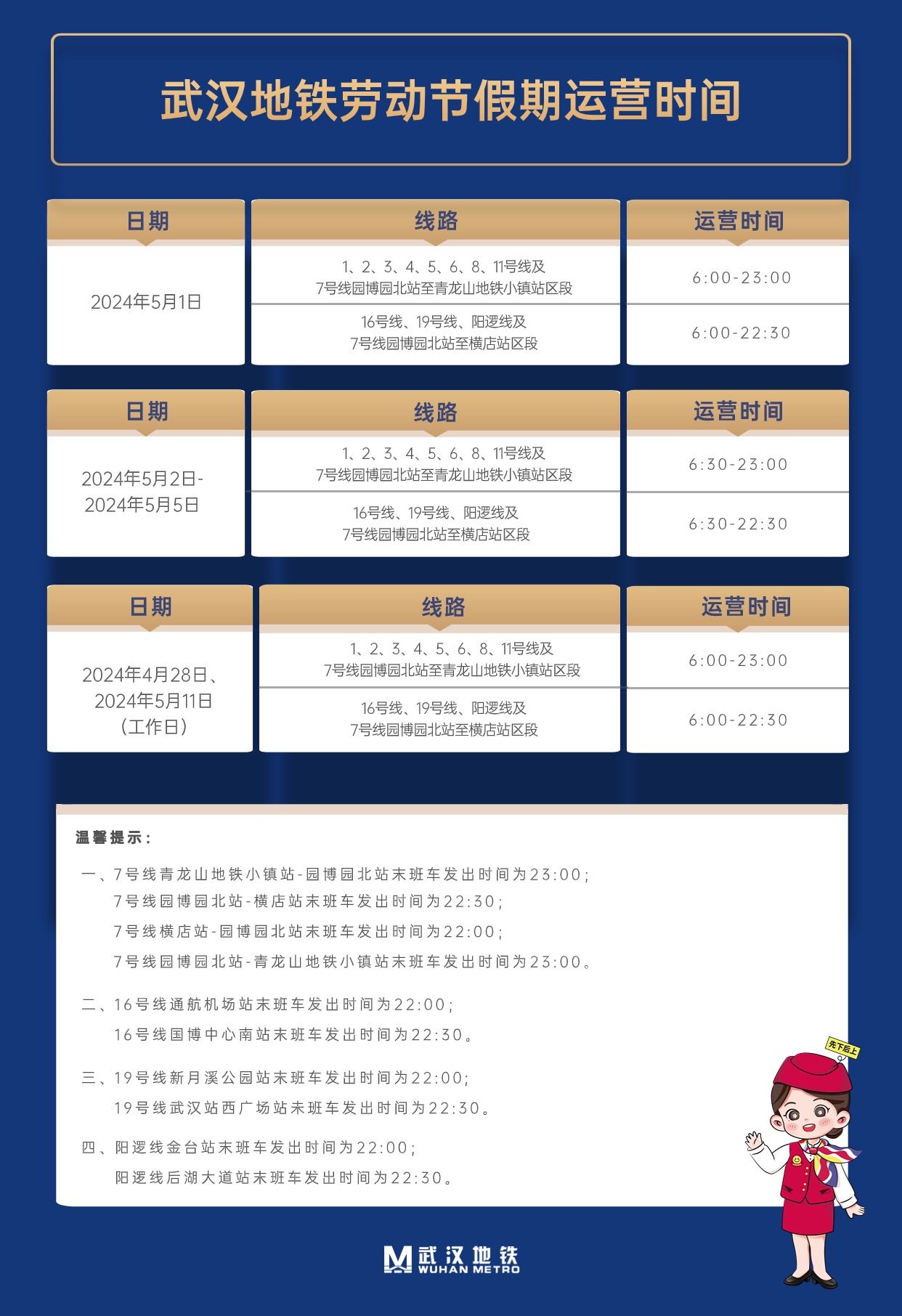 5鏈1鏃ュ姵鍔ㄨ妭鍋囨湡绗竴澶╋紝鍦伴搧绾跨綉鎻愬墠鍗婂皬鏃朵簬6:00寮鐝紝鏂逛究璧舵棭鎹箻鍏朵粬浜ら氬伐鍏蜂箻瀹㈠嚭琛岋紱5鏈2鏃ヨ嚦5鏈5鏃ワ紝鍦伴搧绾跨綉浜6:30寮鐝紱4鏈28鏃ャ5鏈11鏃ヨ皟浼戜笂鐝紝鍦伴搧绾跨綉浜6:00寮鐝