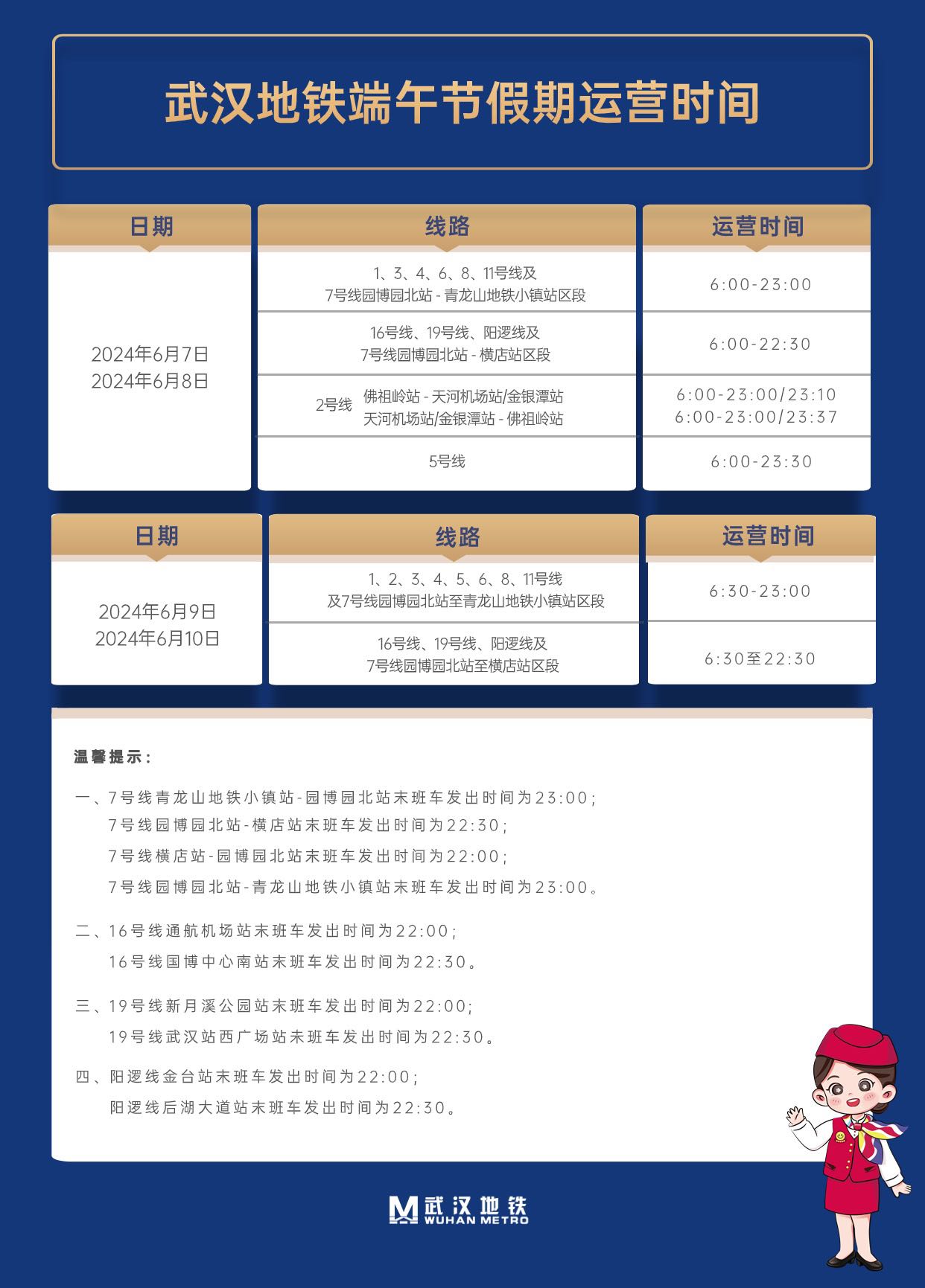 6鏈8鏃ワ紙鏄熸湡鍏級绔崍鍋囨湡绗竴澶╋紝姝︽眽鍦伴搧绾跨綉鎻愬墠鍗婂皬鏃朵簬6:00寮鐝紝鏂逛究璧舵棭鎹箻鍏朵粬浜ら氬伐鍏蜂箻瀹㈠嚭琛岋紱6鏈9鏃ャ10鏃ワ紝鍦伴搧绾跨綉浜6:30寮鐝傛寜鐓у瀛e欢鏃惰繍钀ユ暣浣撳畨鎺掞紝6鏈7鏃ャ8鏃ュ湴閾2鍙风嚎銆5鍙风嚎杩炵画涓ゅぉ寤堕暱杩愯惀鏃堕棿锛2鍙风嚎浣涚宀紑寰閲戦摱娼湯鐝溅鍙戣溅鏃堕棿涓23鏃10鍒嗭紝閲戦摱娼紑寰浣涚宀湯鐝溅鍙戣溅鏃堕棿涓23鏃37鍒嗭紱5鍙风嚎绾㈤湠绔欍佹姹夌珯涓滃箍鍦烘湯鐝溅鍙戣溅鏃堕棿涓23鏃30鍒嗐