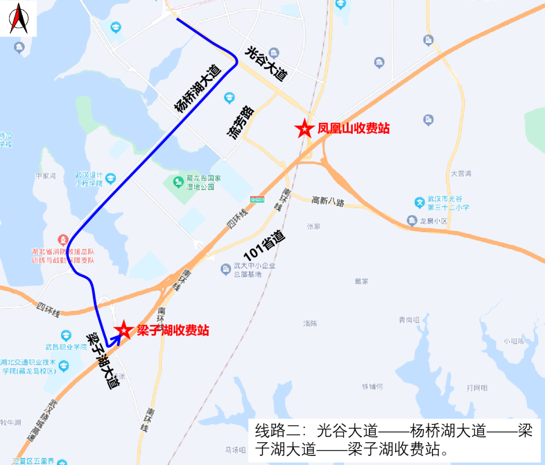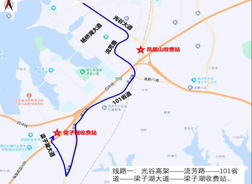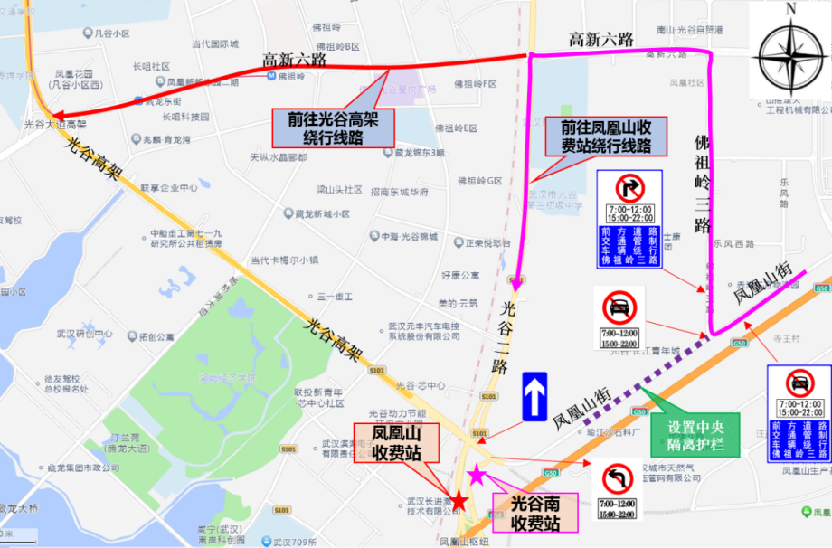 鍒嗘祦鎺柦锛氬嚖鍑板北琛楋紙鍏夎胺浜岃矾鑷充經绁栧箔涓夎矾锛夋瀹炶鍗曞悜閫氳鏃讹紝鐢变笢鍚戣タ杞﹁締鍙敱浣涚宀笁璺旈珮鏂板叚璺斿厜璋蜂簩璺繘鍑ゅ嚢灞辨敹璐圭珯锛岀敱涓滃悜瑗夸笂鍏夎胺楂樻灦杞﹁締鍙敱浣涚宀笁璺旈珮鏂板叚璺笂鍏夎胺楂樻灦銆
