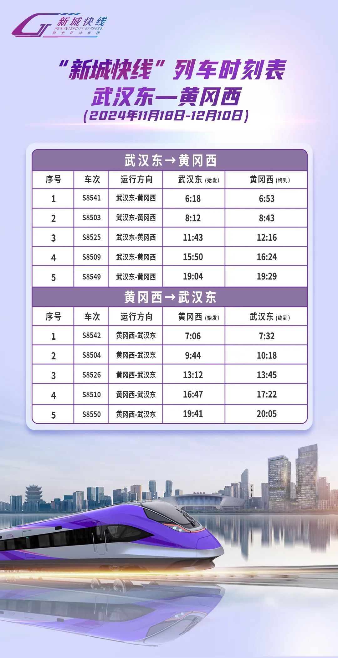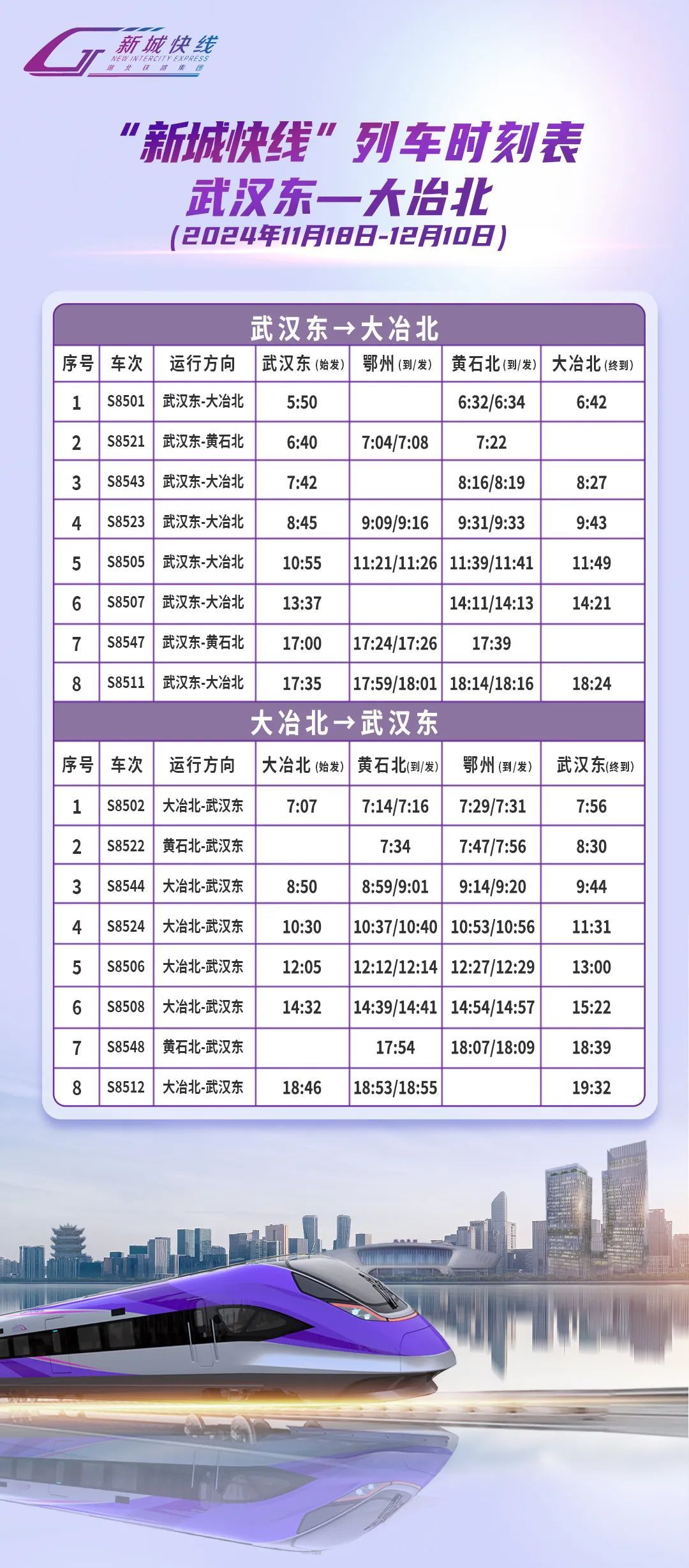 鎺ュ浗閾佹姹夊眬闆嗗洟鍏徃閫氱煡锛2024骞11鏈18鏃ヨ嚦12鏈10鏃ユ湡闂粹滄柊鍩庡揩绾库濆垪杞﹀紑琛屾椂鍒绘湁璋冩暣锛岀幇浜堜互鍏憡銆傝澶у鍑鸿鍓嶅強鏃舵煡鐪嬧滄箹鍖楅搧璺泦鍥㈣建閬撹繍钀ユ湁闄愬叕鍙糕濆井淇″叕浼楀彿鎴栨敮浠樺疂銆佸井淇♀滄柊鍩庡揩绾夸箻杞︾爜鈥濆皬绋嬪簭涓殑鏈鏂版椂鍒昏〃銆