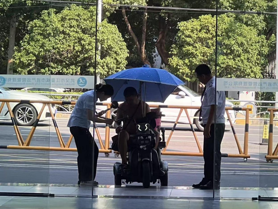 7月16日午后,纸坊营业所午间值班员占迪迪留意到,一位用户在营业大厅入口处因腿脚不便而犯难。她快步上前,引导对方通过无障碍通道顺利入内。