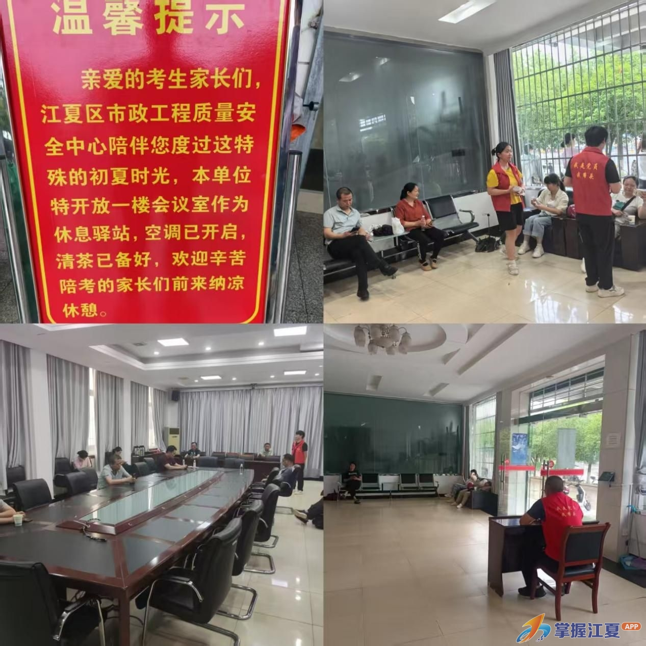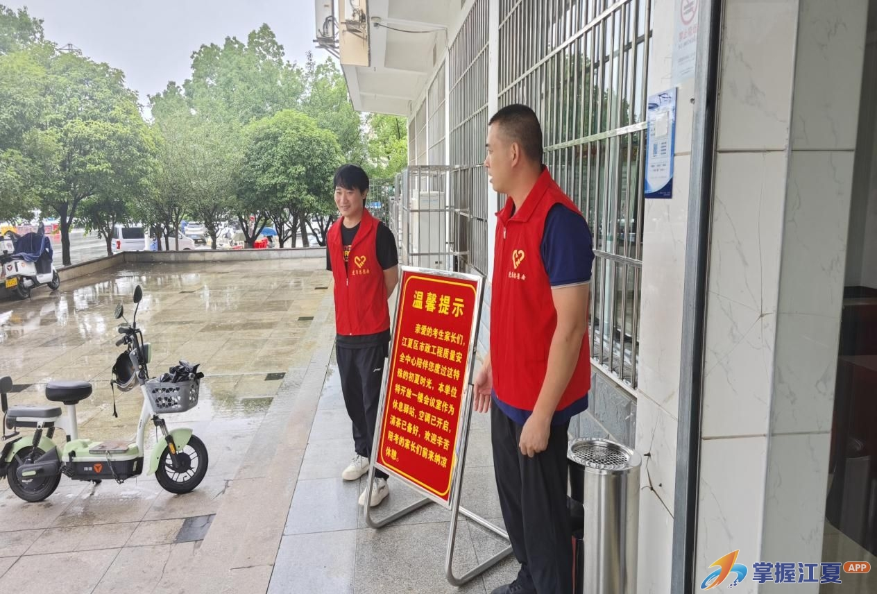 又是一年中考时。考场内,莘莘学子奋笔疾书,汗水浸透了青春的答卷;考场外,翘首以盼的家长们顶着风雨,焦灼与期盼交织,成为一道独特而令人动容的风景线,就在这个牵动人心的日子里,距江夏一中考点“一路之隔”的区住更局质量安全中心党支部以实际行动践行“我为群众办实事”的初心,精心策划并迅速启动了“中考护航,先锋暖人心”志愿服务活动。6月20日-22日,区住更局质量安全中心开放了2号楼一楼会议室,为考生家长提供遮阳避雨休息场所、提供茶水、卫生间等便民服务,充分发挥先锋模范作用和服务民生的担当精神,全力为中考保驾护航。