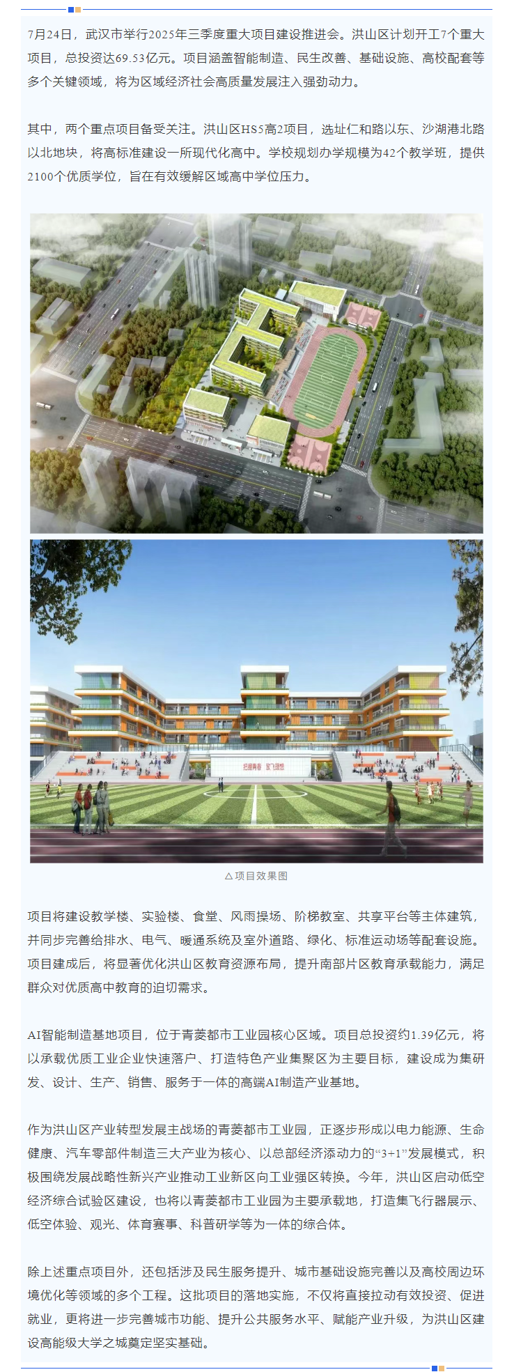洪山区总投资69.53亿元,7大项目拟开工,含新建高中与AI智造基地