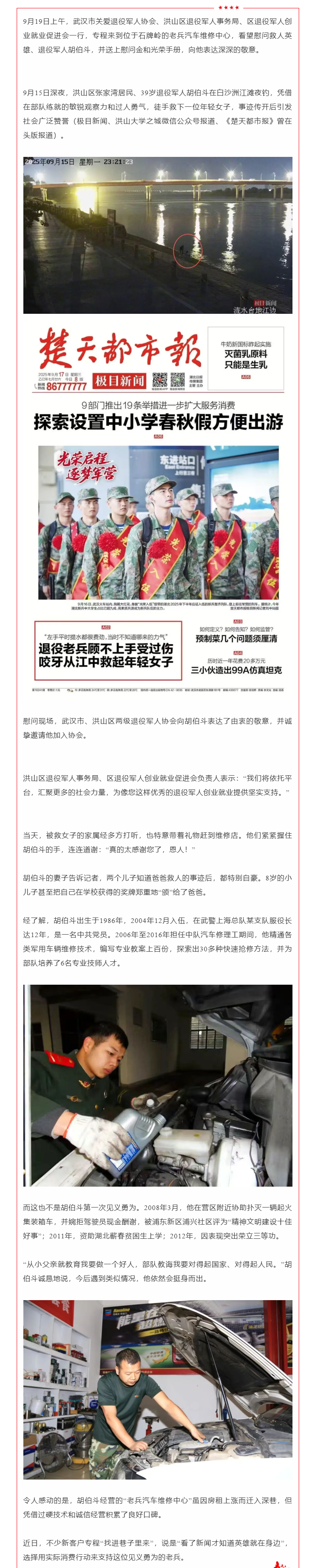 老兵胡伯斗深夜江边救人,退役军人事务部门上门慰问,小巷修车店迎来“暖心流量”