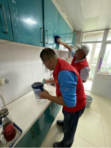 在庄严的缅怀活动之外,另一支温暖的志愿小分队正穿梭于江汉区的街巷中,他们逐个上门为6名烈属、伤残军人、重点优抚对象家庭开展“入户清洁·温暖人心”家政志愿服务。这些高龄、独居的退役老兵家庭是江汉区退役军人事务局在日常走访慰问中了解到有家政服务的需求后,为关心关爱老兵家庭生活,区局联系该军创企业的清扫志愿者服务队,在国庆佳节前,为他们带来个性化、贴心的服务。清洁服务直击老年家庭日常打扫难点:在厨房,志愿者使用专业去油产品,对积累厚重油污的灶台、油烟机、墙壁进行彻底清洁;在卫生间,重点攻克水渍与霉菌,对玻璃隔断、便池进行深度消毒除垢;还主动清理床下、柜后等日常难以触及的卫生死角,极大改善了老英雄们的居住环境。