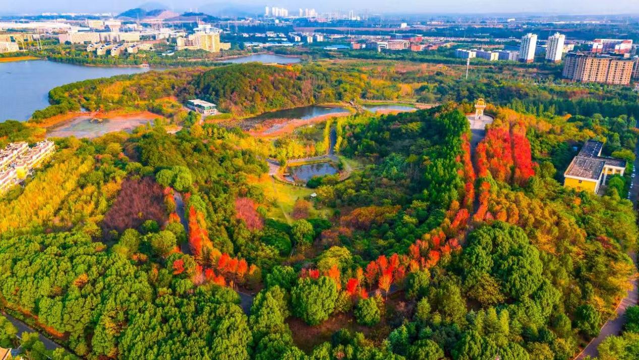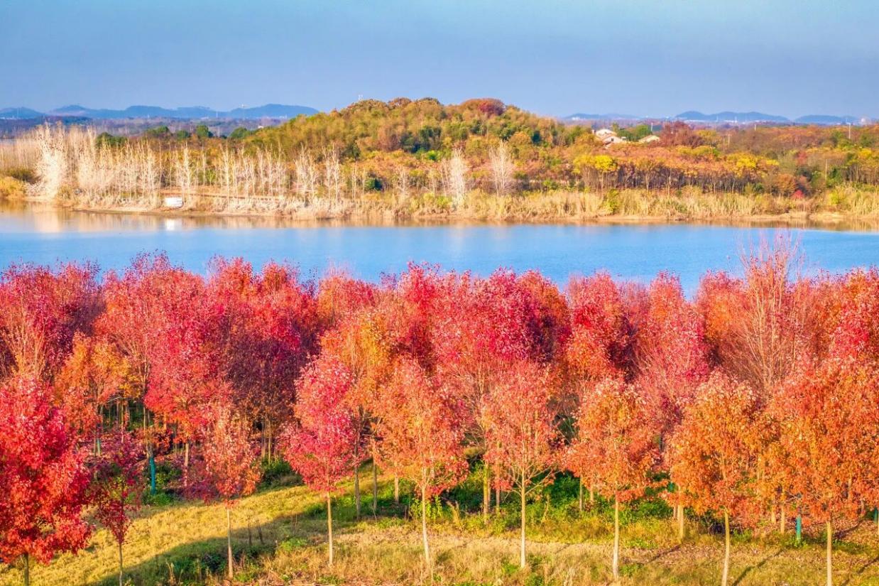 安山郊野公园进一步点缀了这片生态画卷。公园内5000亩苗木花卉基地打造出梨花谷、桃花谷、荷花谷、樱花谷等特色景观。初冬时节,红叶谷与青春村郭家湾的枫树层林尽染,绘就一幅绚丽的诗意画卷。