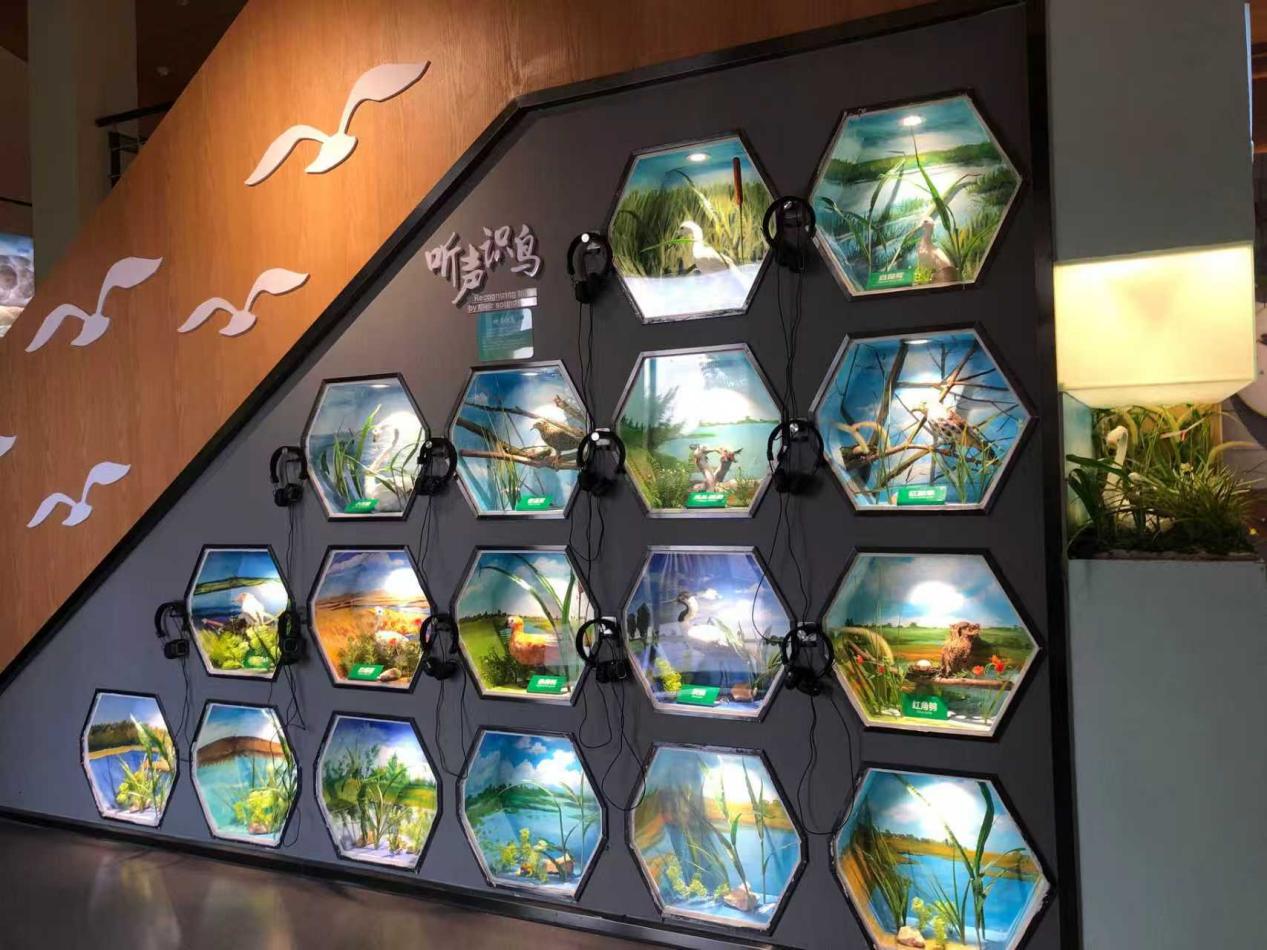 在公园的入口处,有一个湿地科普馆,这里不像一般科普馆只展列标本、照片,只能满足游客走马观花式的、毫无参与感的体验,而是同时融入了多媒体技术,并利用视频、湿地全景展示系统等形式为载体,让游客可以通过互动式的体验学习到更多的科学知识。对于那些来了却没有机会一睹湿地公园珍稀动物真颜的游客来说,馆内专门设置的 "听声识鸟"展厅,可以让游客身临其境般地去感受那些珍稀动物的鸣叫声,那种的立体式的沉浸感,非常适合带上孩子一起来体验一番。