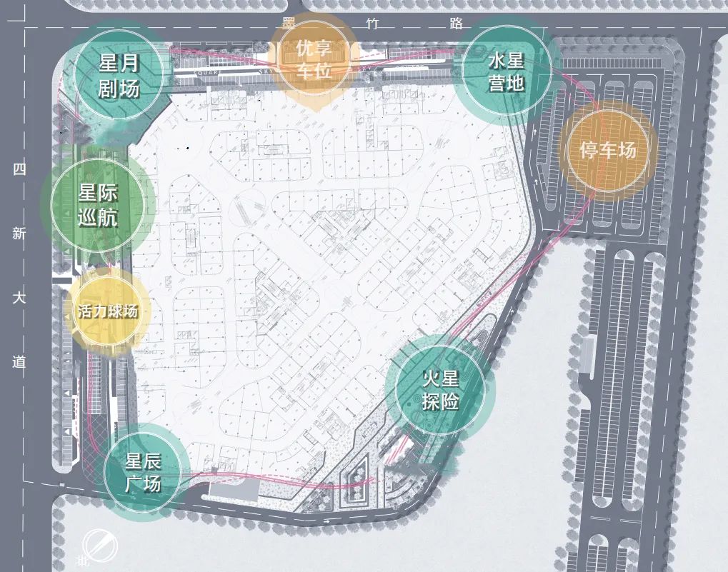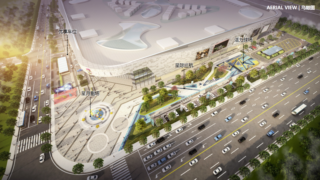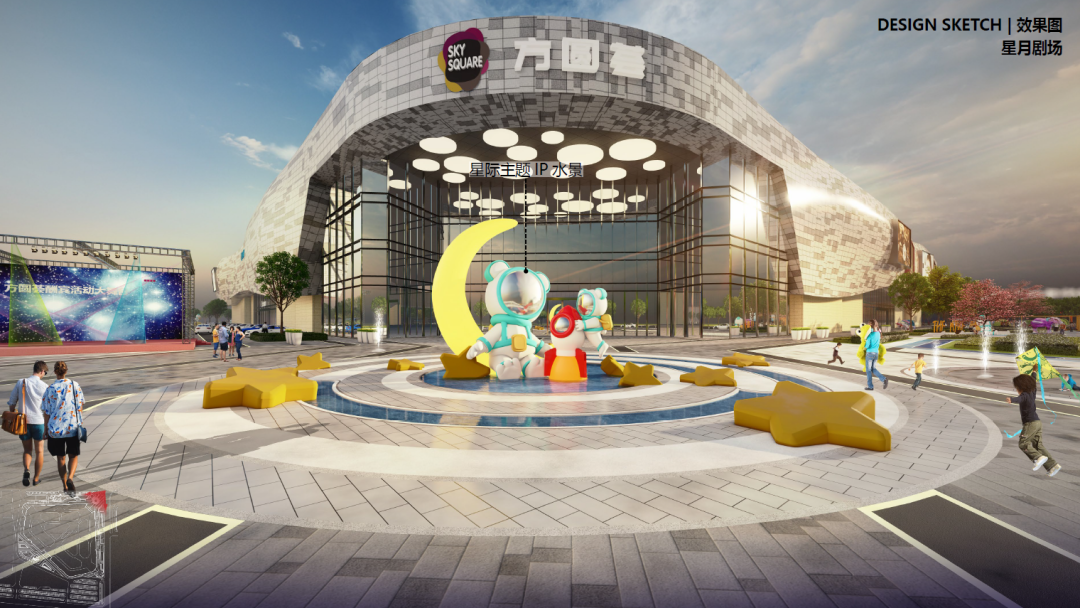 鍗囩骇鍚庯紝瀹ゅ4涓囧钩鏂圭背鐨勫箍鍦哄皢浠モ滅┛瓒婃槦绌衡濅负璁捐涓婚锛屽皢澶栧洿鐨3澶т富鍑哄叆鍙o紙鏄熸湀鍓у満銆佲傛槦杈板箍鍦恒佹按鏄熻惀鍦帮級銆佽繍鍔ㄦ父涔愬満銆佺豢鍦版櫙瑙傘佸澶栧仠杞﹀満绛夌浉浜掍覆鑱旓紝鎵撻犲嚫鏄惧睍绀烘с佽叮鍛虫с佽仈鍔ㄦх殑涓婚寮忓煄甯傚晢涓氬叕鍥